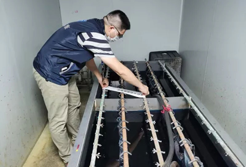 檢查發現,該作坊主要從事五金電鍍業務,現場未能提供工商營業執照,也沒有相關環保審批、驗收手續。該電鍍作坊是一間置於民房天台的單層活動板房,有黑色網布遮掩,板房的加工區域設有三重門禁,電鍍工序設置在最內層的密室中。執法人員進入密室後,發現兩條正在工作的電鍍槽。